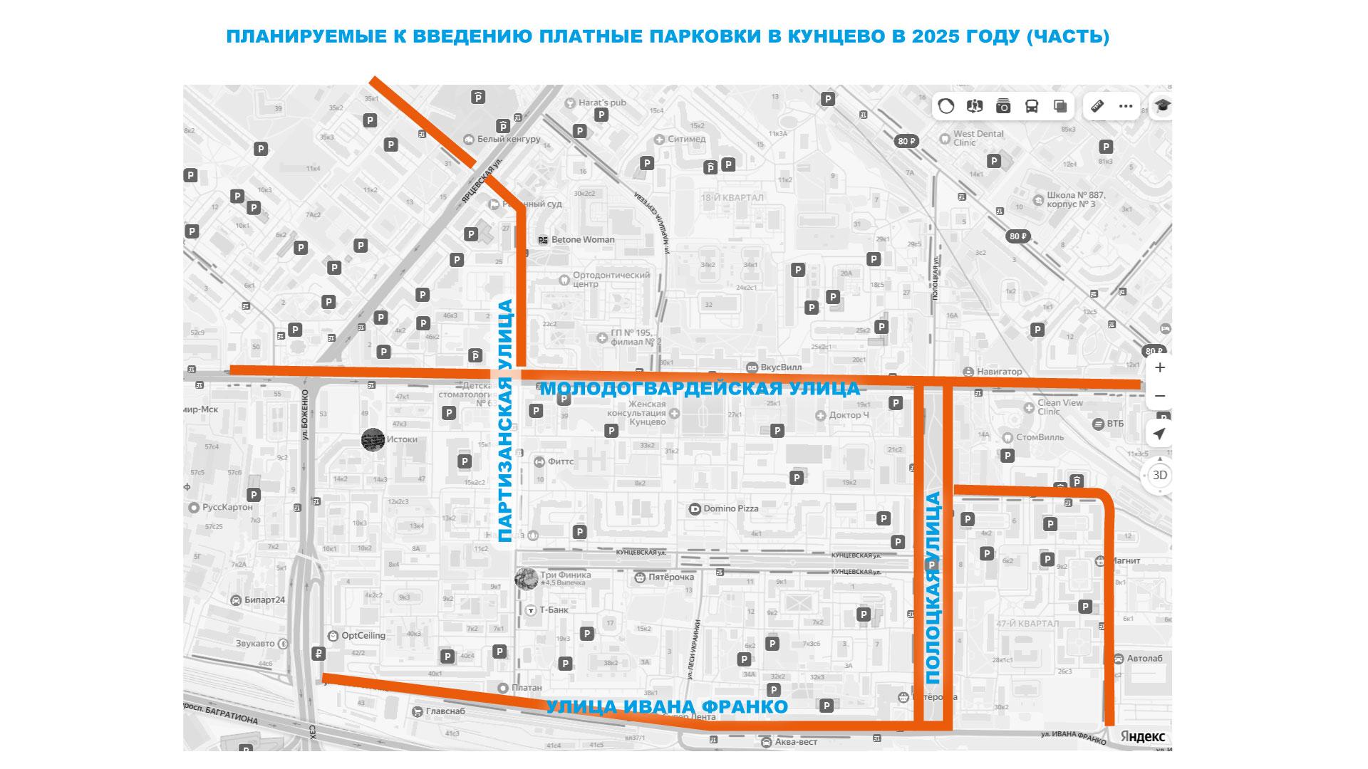 Тем не менее, с 15 августа 2025 года вводятся платные парковки и режим резидентных разрешений на ряде улиц Кунцево (в том числе: Ивана Франко, Молодогвардейская, Полоцкая и др.). Это вызвало массовое возмущение среди местных жителей, так как никакой объективной транспортной необходимости для подобных мер не существует. На этих улицах почти всегда есть свободные парковочные места, нет перегруженности, пробок или борьбы за пространство.