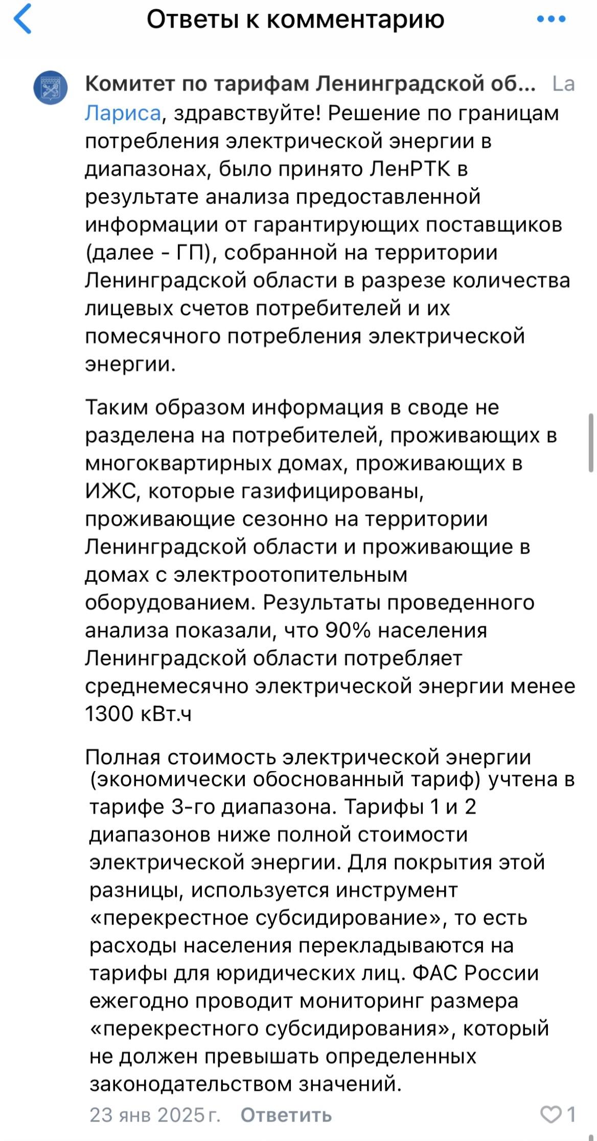 Комитет по тарифам в социальных сетях ответил, как производился расчет диапазона: «В среднем по Ленинградской области потребление менее 1 300 кВт/ч в месяц, если брать все население. Например, 9 человек потребляют 600 кВт/ч в месяц, а один человек 7 500 кВт/ч/мес, в среднем их потребление менее 1 300 кВт/ч». Получается, ЛенРТК вывело среднее арифметическое для всего населения, без разделения на подгруппы «МКД» и «жилые дома», что создает ценовую дискриминацию для населения, проживающих в жилых домах.