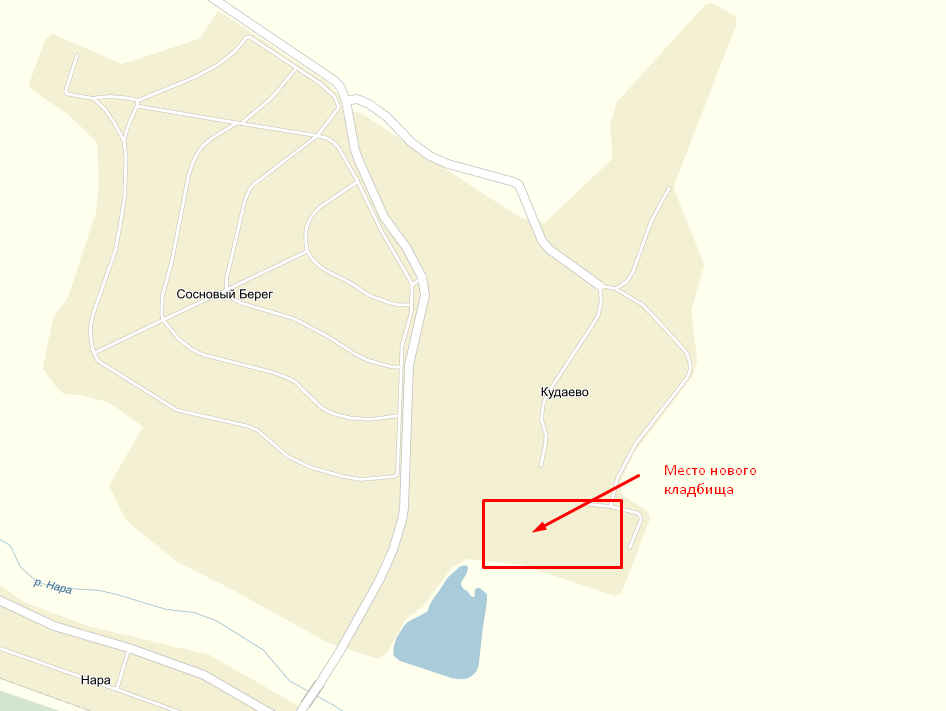 Без согласования с жителями деревни Кудаево, СНТ "Нара" и "Сосновый берег" (Московская область, Чеховский район) местной администрацией было принято решение о создании нового кладбища около деревни Кудаево, причем всего в полкилометре уже есть кладбище около Храма Спас-Темня.