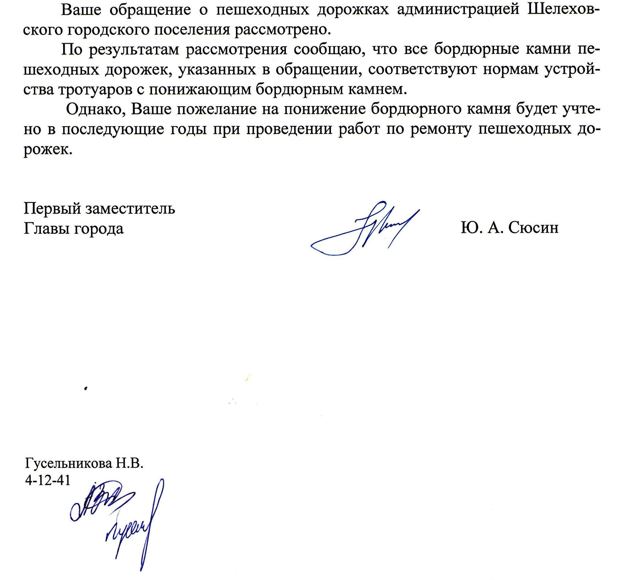 На остановке "Училище" города Шелехова крайне неудобно передвигаться по пешеходному переходу маломобильным группам населения: родителям с колясками, пожилым людям с тележками/чемоданами, инвалидам-колясочникам. Местные власти считают, что с переходом всё в порядке, прилагаю письмо с их ответом на запрос исправить ситуацию. Они утверждают, что все бордюрные камни пешеходных дорожек соответствуют нормам тротуаров с пониженным бордюрным камнем. Между тем, если почитать СНиП 35-01-2001, раздел 3, пункт 3.4 "Высота бортового камня в местах пересечения тротуаров с проезжей частью, а также перепад высот бордюров, бортовых камней вдоль эксплуатируемых газонов и озелененных площадок, примыкающих к путям пешеходного движения, не должны превышать 0,04 м." выходит, что бордюрный камень по их словам высотой 4 см, однако, как было измерено, высота его превышает 15 см, что не соответствует нормам.