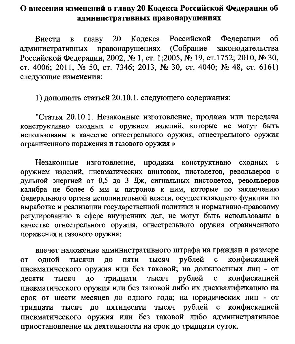 Росгвардией предложено внесение поправок в главу 20 Административного кодекса. Данные поправки устанавливают ответственность за оборот изделий сходных с оружием, но которые при этом не могут быть использованы в качестве оружия - см. прикрепленное изображение.
